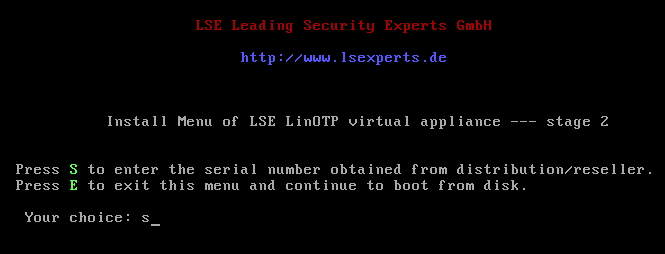 Type “s” and confirm with [Enter] to enter the serial number of the LinOTP Virtual Appliance. You received the serial number together with the license file when you made your purchase. The serial number will be verified. After the verification, you can continue by pressing any key.