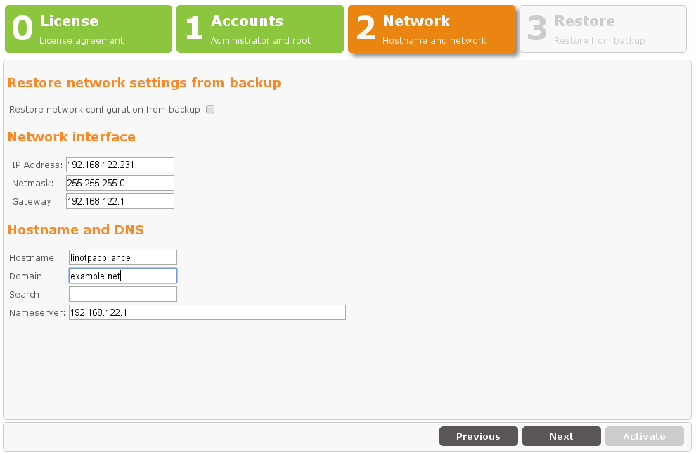 Please be aware: if your old Appliance is running in the same network environment as the new machine you should not restore the IP from the backup - because both machines would run with the same IP causing problems. So either shutdown the old machine or configure a different network setting for the new one. You can change this configuration at any time later in the management web UI.