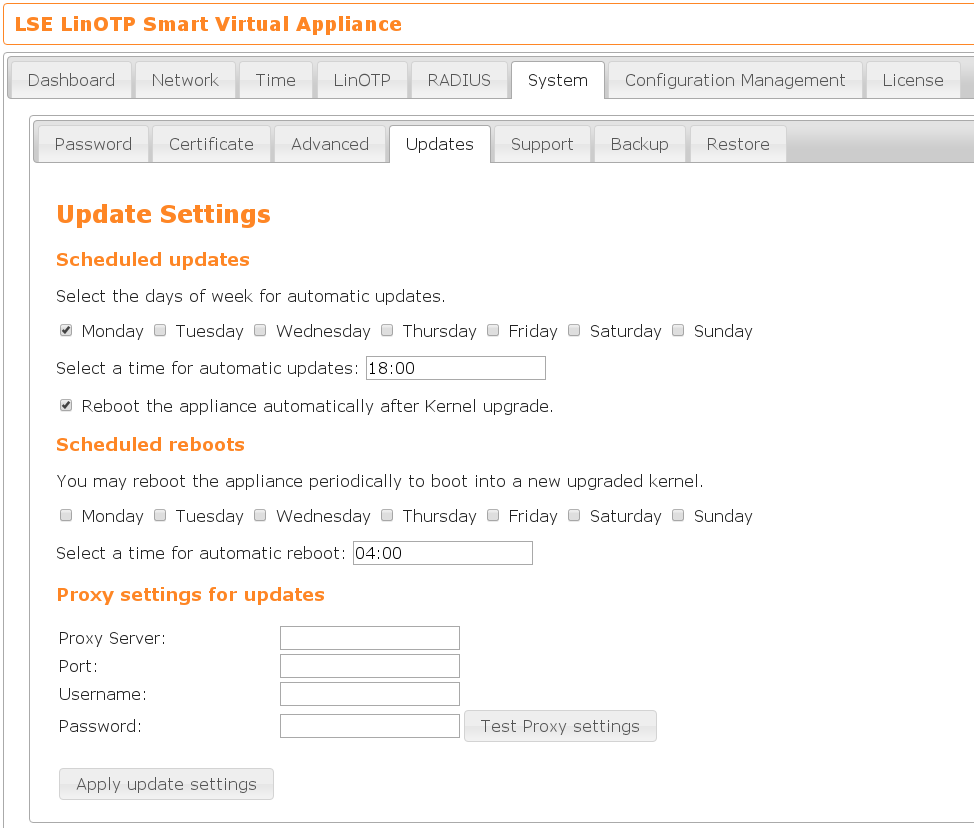 We recommend to perform updates on a regular base in order to keep the operating system secure and to benefit from newer versions of LinOTP and the appliance itself.