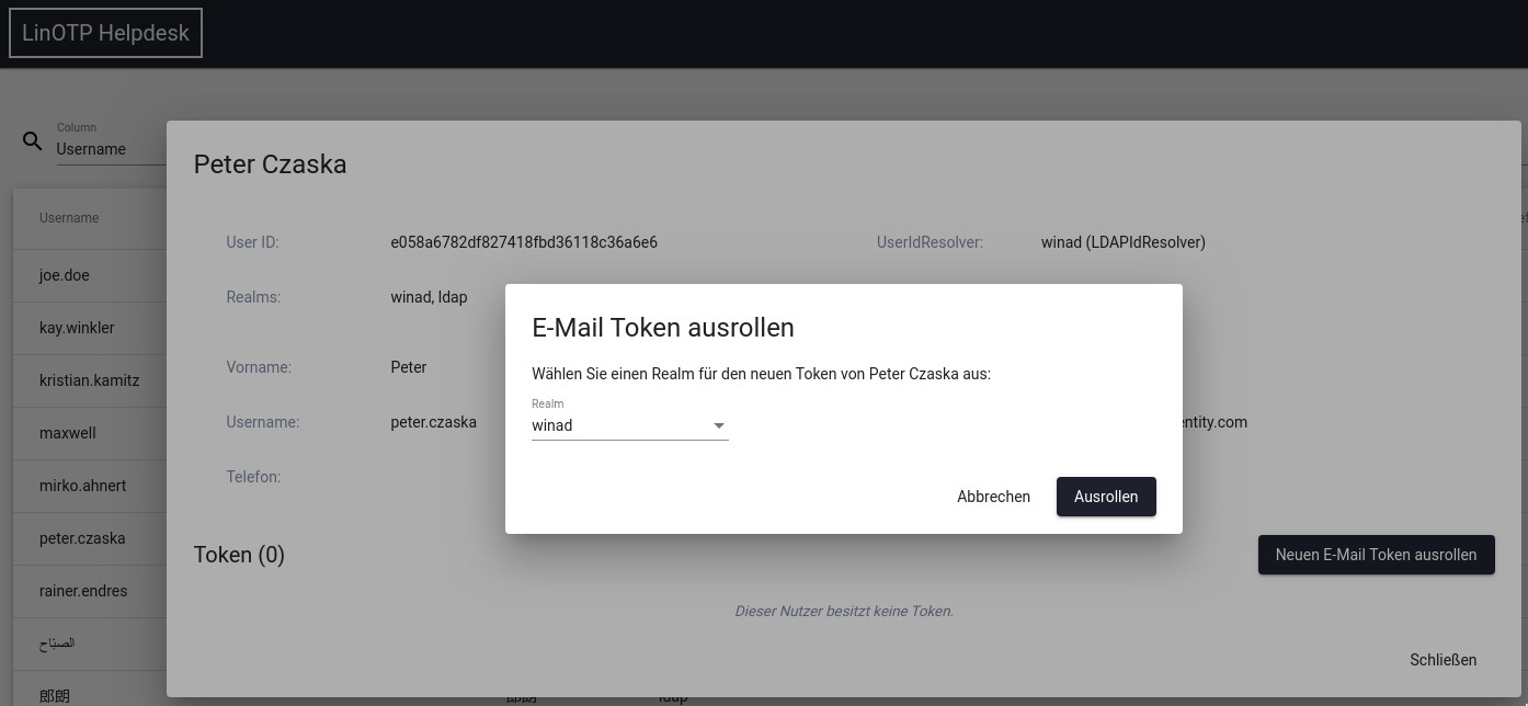 The token is rolled out to the selected user, the user can be listed in different realms. If necessary, the correct realm must be selected. Which realm the operator sees here can be controlled by his admin policy.