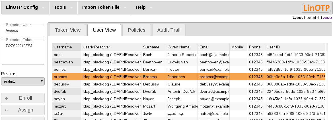 Tokens will be assigned to users. LinOTP does not possess a builtin user-management so it can (and must) be connected to the user directories of your choice. These can be LDAP-based directory services (Microsoft Active Directory, Novell eDirectory, Open LDAP, amongst others), SQL-based databases or flat files such as /etc/passwd.