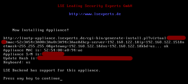 - The installation of KeyIdentity LinOTP Virtual Appliance begins after the necessary components have been downloaded from the KeyIdentity server. Please note that all data saved on this (virtual) system will be lost.