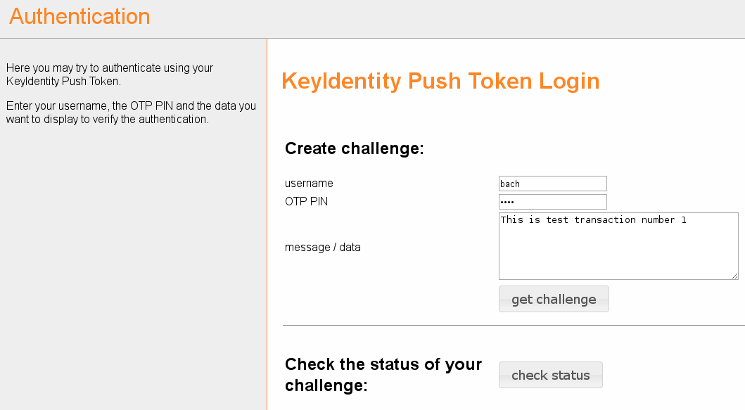 Enter username[@realmname] and OTP PIN (the PIN depends on the otppin policy, realmname is necessary for users in non-default realm) and press get challenge.