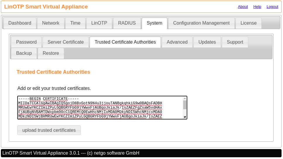 The complete chain is inserted in the Appliance configuration in the tab System -> Trusted Certificate Authoroties (copy and paste).