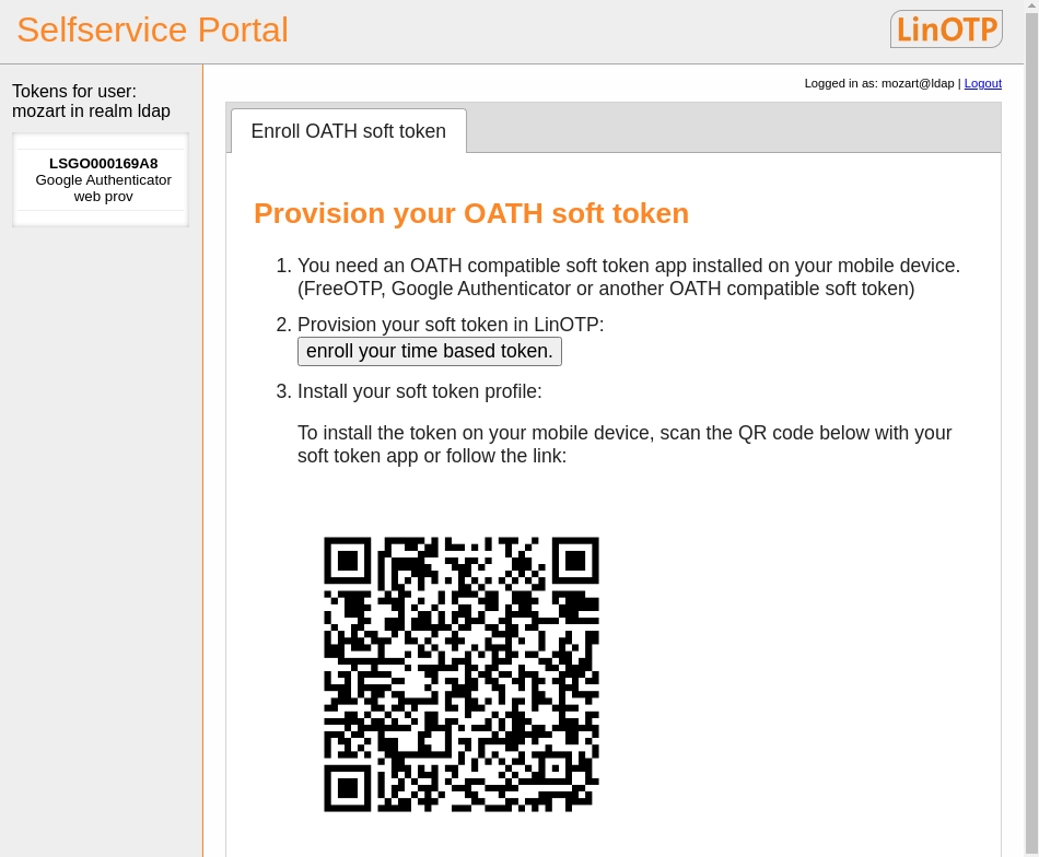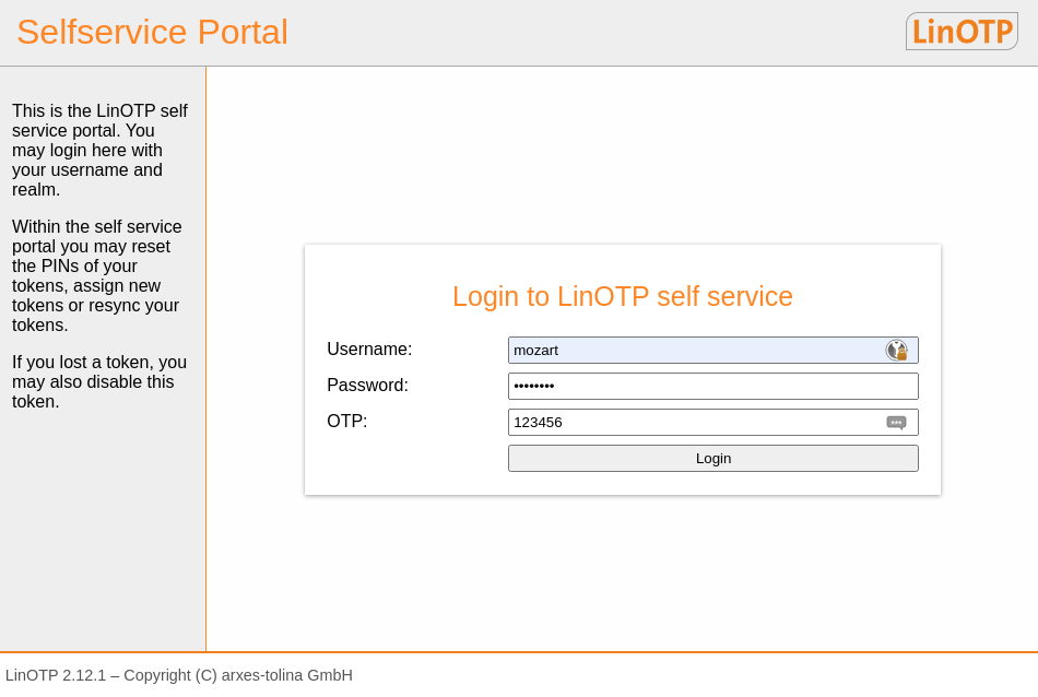 LinOTP provides for this purpose the self service portal. Although the actions - like token enrollment - can be limited to local network clients it might be necessary that users from untrusted networks can enroll their tokens as well. By default the username and the user password are required to log in to the self service portal. This would mean that the enrollment of the second factor depends on the knowledge of the first one. No clean separation and a possible weak link which could be exploited by an attacker. In order to prevent this attack vector the self service should be protected with a second factor. This is very sane and can be configured easily in LinOTP.