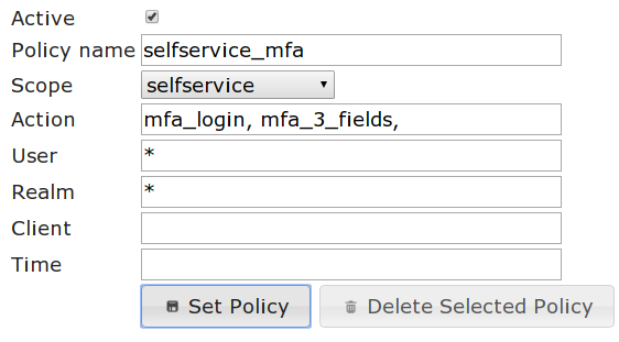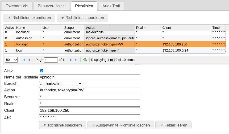The two policies in scope=authorization with action=”authorize, tokentype=PW” allow validation for tokens of this type. The client contains the accesses through which the login is possible. For this, “Override authentication client:” must be set to ‘127.0.0.1, ::1’ in the system configuration. If this policy is not set, validation is possible from all clients.