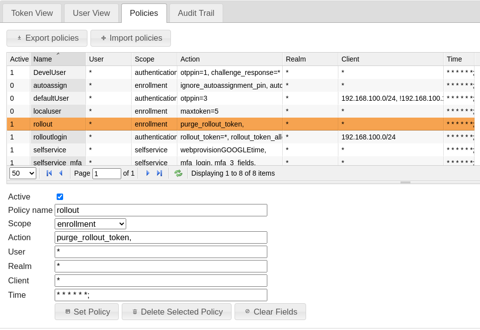 By default the rollout token stays until actively delete. For security reasons it might be sensible to remove the rollout token once the user has the final token. This can be configured via the following policy: