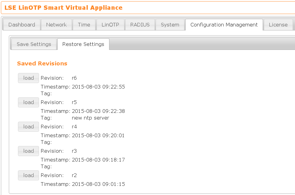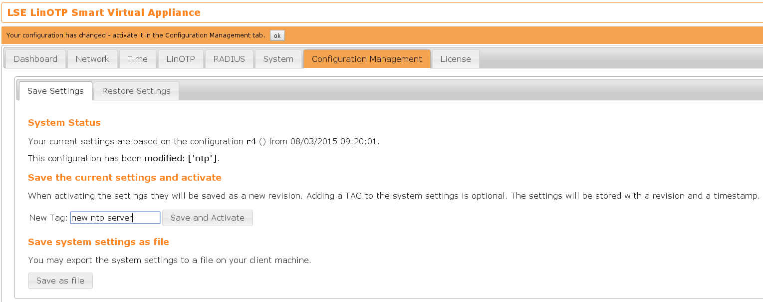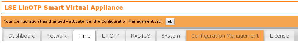 The LinOTP server saves each configuration set before activating the configuration.
