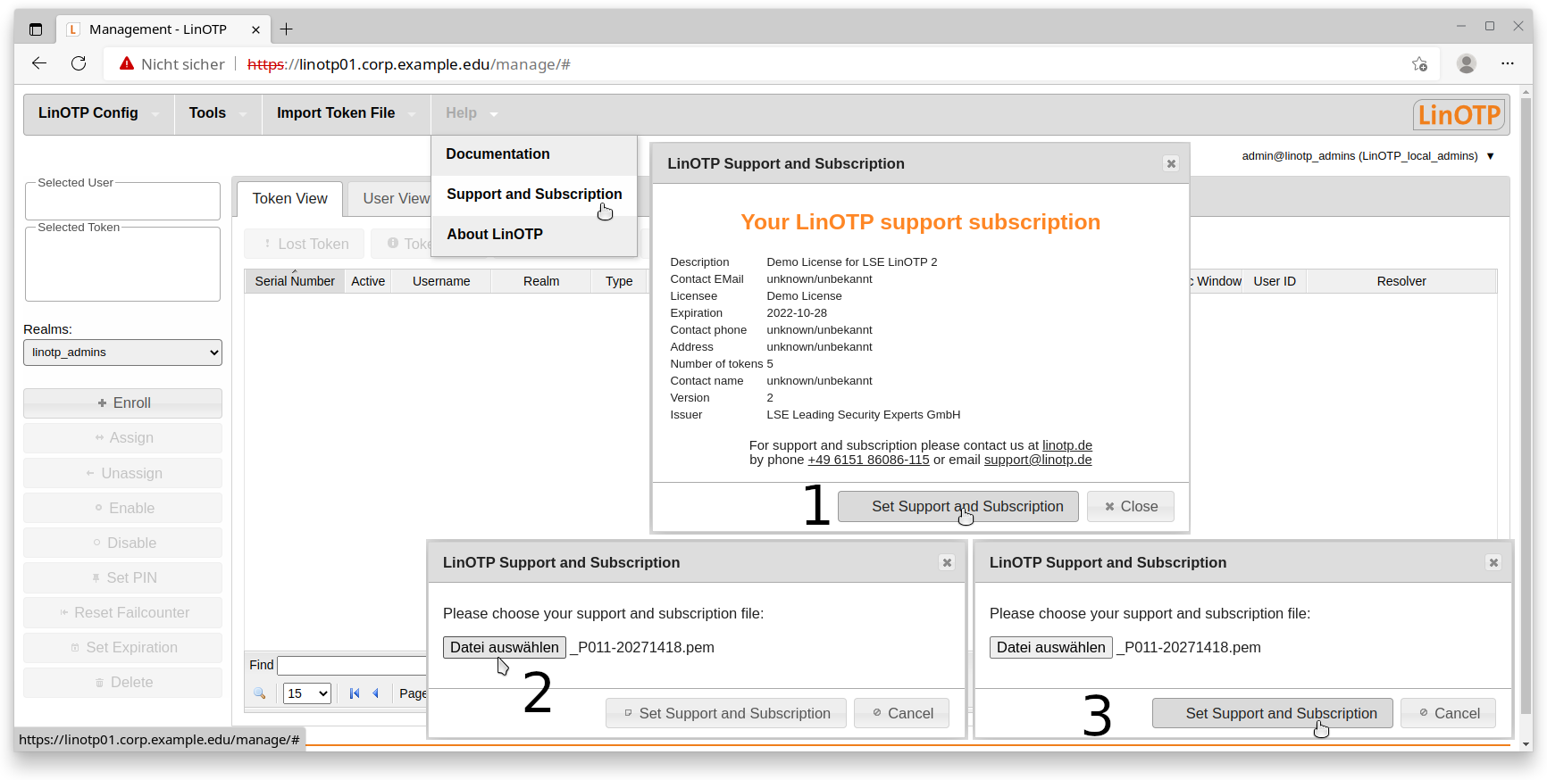 The purchased license is valid for a certain period of time and can then be exchanged according to the following instructions. The license is part of the SVA backups and should be checked for validity after a restore. As soon as messages appear in the /managent about an expired license or a number of tokens exceeding the limit, our sales department should be contacted to correct the license.