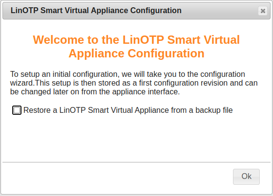 Please check the box “Restore a LinOTP Smart Virtual Appliance from a backup file” if you would like to restore the machine from a backup file. You will see the head of the website changing to contain fewer configuration items. Continue otherwise with the normal setup procedure as described below.