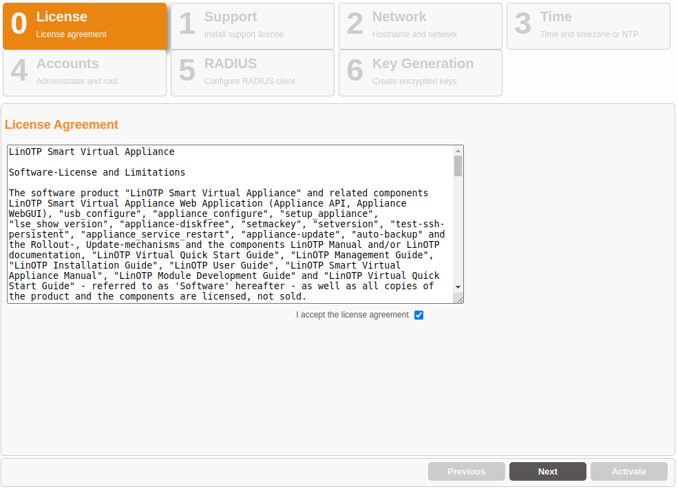 The software of the Virtual Appliance, Hardware Appliance and LinOTP are protected by copyright. You can find the complete license conditions at Install a new license. In addition, they are displayed upon the first use of the Appliance as the first step of the configuration wizard.