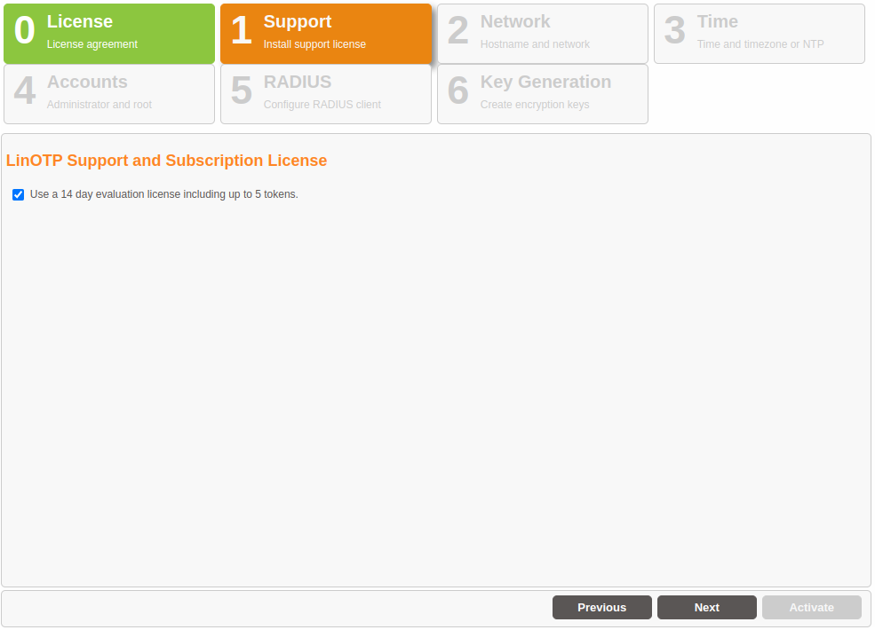 LinOTP Smart Virtual Appliance can be acquired with a existing LinOTP Enterprise Subscription and Support License. Subscription and Support are licensed for the number of active token managed in LinOTP. You can find instructions on installing the license file during the configuration wizard in part 2 of this Quick Start Guide. Please have a look at Install a new license.