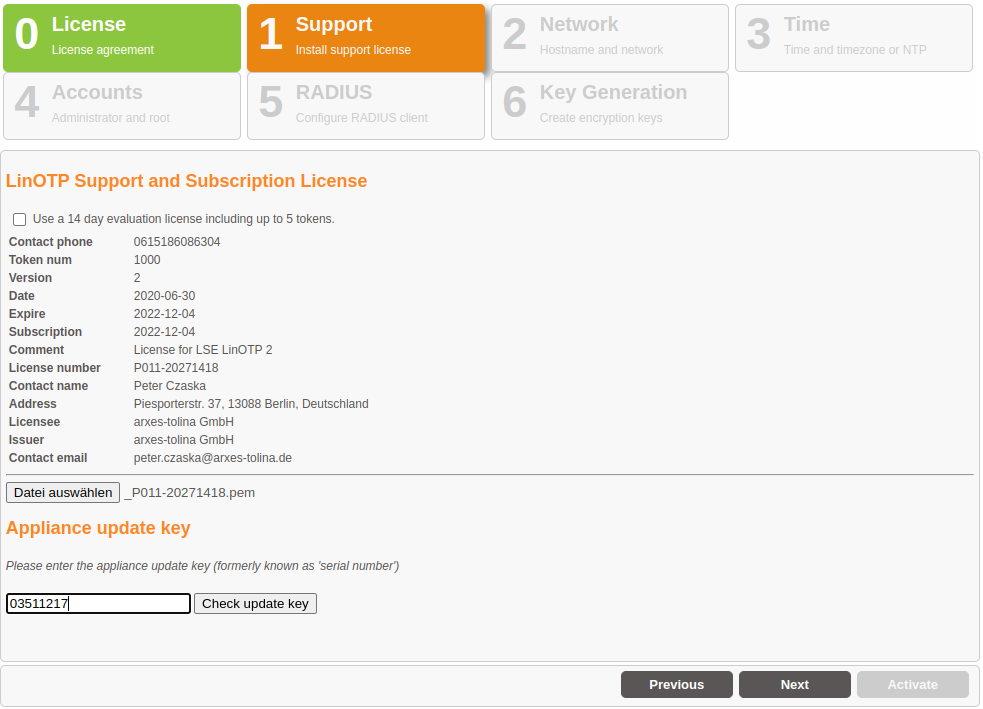To run the LinOTP Smart Virtual Appliance in a production mode uncheck the evaluation checkbox and enter your LinOTP Enterprise Token license and your LinOTP Enterprise Subscription and Support update key.