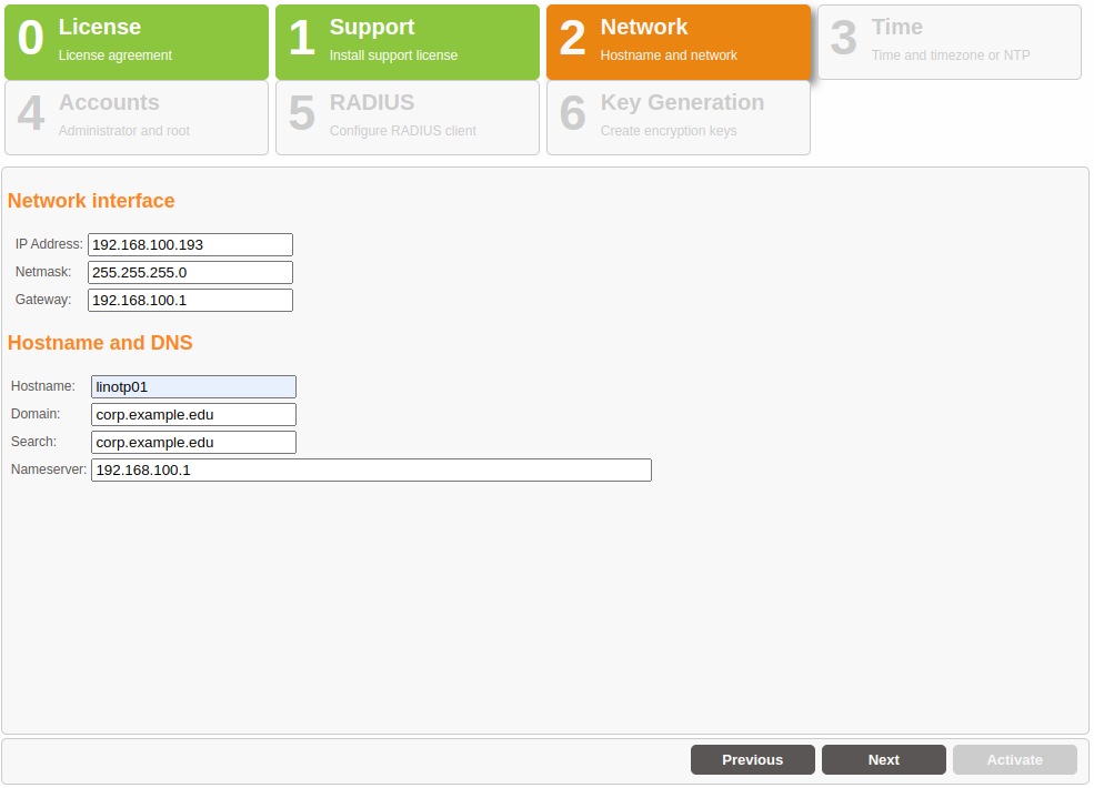 Enter the hostname of the LinOTP server here. You can freely select this hostname, however, it should not already be used by another device in the network. Please enter the name of the domain in which the LinOTP Appliance is located separately in the next field. A list of domains can be entered in the “Search” field that will also be searched. Normally, you will enter the domain names there again.