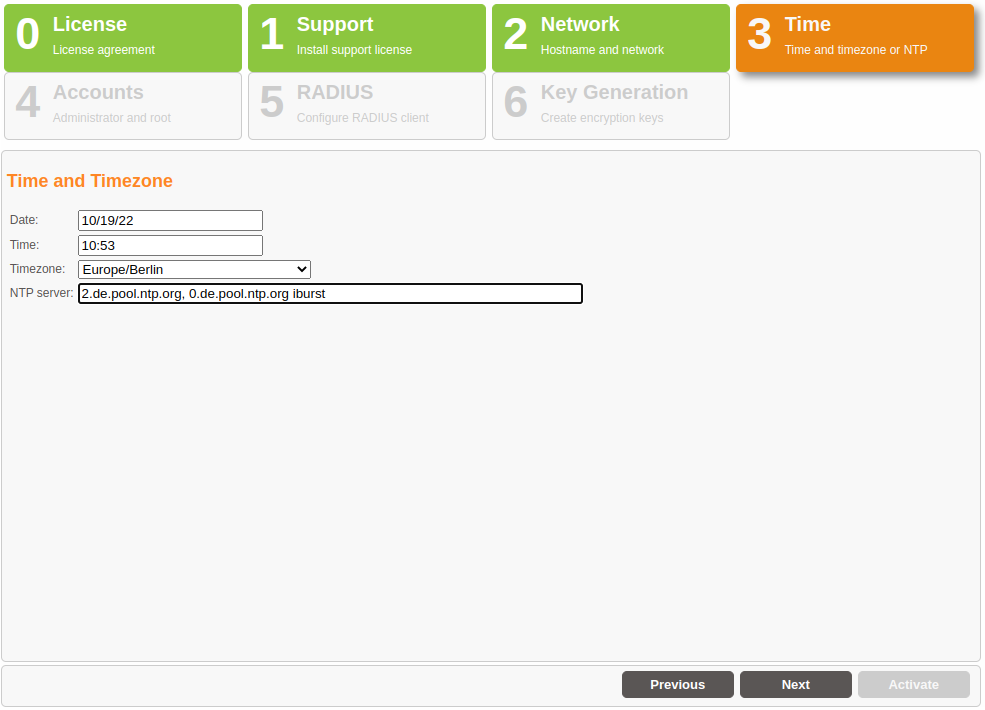 In a third step, you can change the date, time or time zone, if necessary. An NTP server can be entered from which the time is automatically received, if applicable.