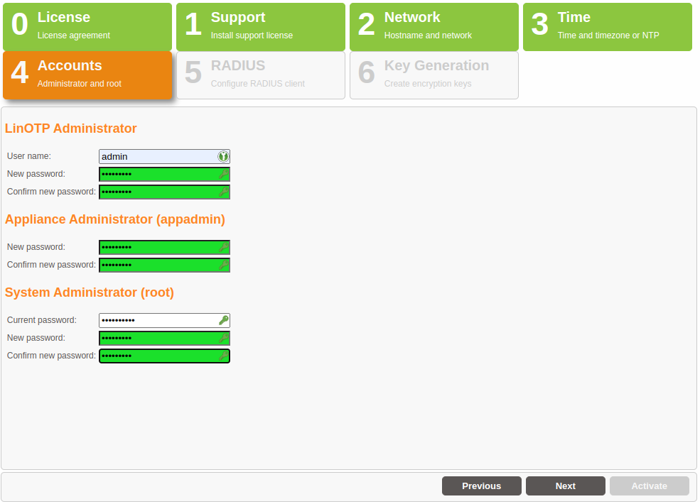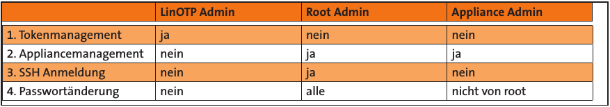 LinOTP Administrator – the LinOTP Administrator manages LinOTP. She does not have any rights on the level of the Appliance, operating system or on the network level. The name can be chosen and additional administrators can be configured later in the running system.