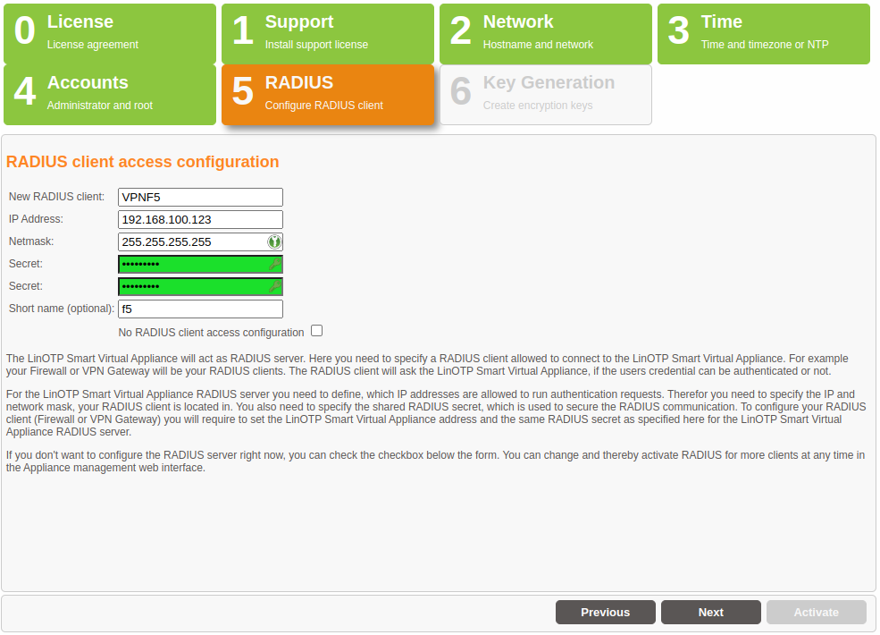 In this step, you will define the first RADIUS client to be allowed to issue authentication queries to the RADIUS server of the LinOTP Appliance. Additional clients can be added and managed via the LinOTP Management after the completion of the initial configuration.