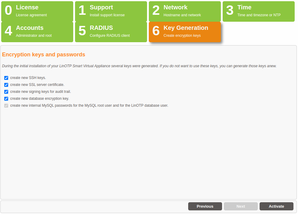 In the last step, you decide whether the factory installed keys for SSH, SSL and to encrypt the files in the database and the internal database passwords should be generated again. This is absolutely recommended when running the wizard for the first time in order to prevent unauthorized third parties with knowledge of the factory installed keys and passwords from accessing the system or the files.