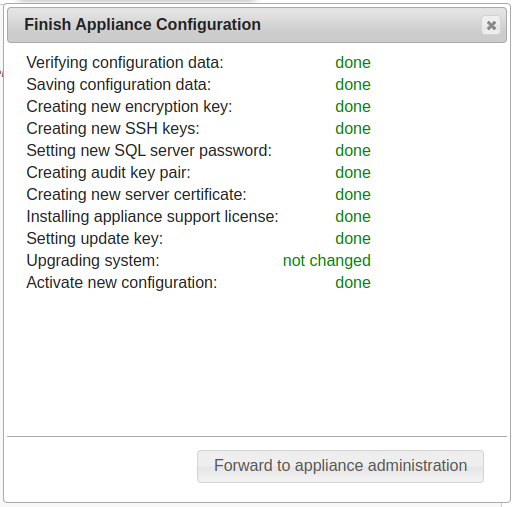 Click the “Activate” button to save all entries, activate and – if selected – shutdown the Appliance. All further configurations can be made from any computer within the network.
