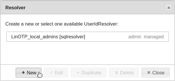 A window will appear that shows the resolver you have created (name and type). You can now connect to additional user directories (“New”), editing existing resolvers (“Edit”) or delete them (“Delete”). To do so, the listed resolvers must be marked (highlighted). Then close this window with “Close”.