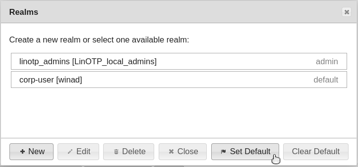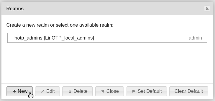 To do so, select the corresponding menu item, “Realms”, in the “LinOTP Config” menu and click on “New” in the window that opens.