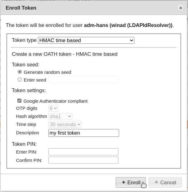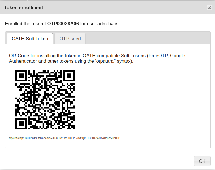 Click on “Enroll” and select “HMAC event based” and “Generate HMAC key” to generate a new seed. The QR code generated can be read by various software tokens (Google Authenticator or FreeOTP, for example).