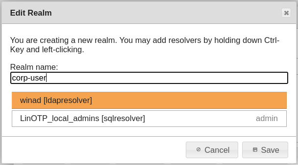 First of all, enter a name and then select the User ID Resolver of a connected user directory (the selection will be highlighted). You can select multiple User ID Resolver to join them together in one realm.