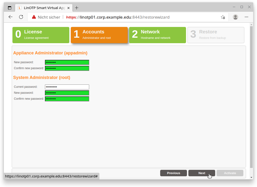 Once you have entered all of the passwords, go ahead to the next step by clicking the “Next” button. Please note that the input mask depicted can only be exited when all fields have been completed and the newly entered passwords are highlighted in green. Scrolling backwards using the “Previous” button is also not possible until the fields have been fully completed.