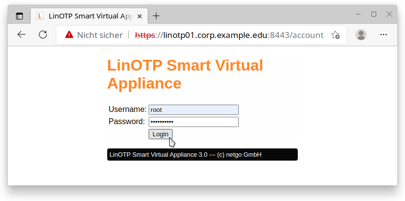 Launch your browser and enter https://<IP_address_of_your_LinOTP>:8443 in the address line in order to access the web-based configuration interface of the Appliance.