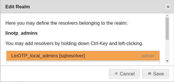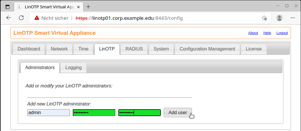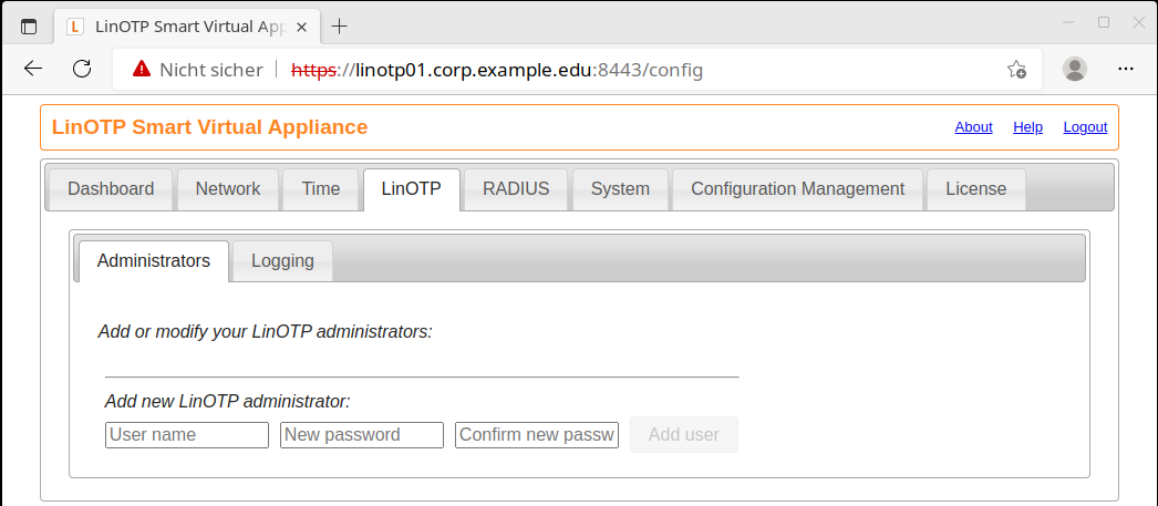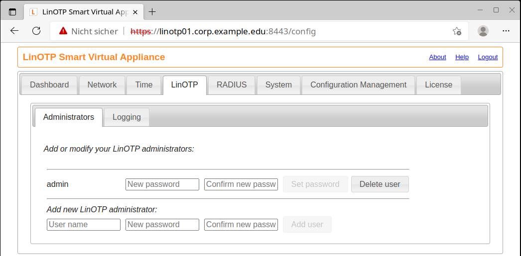 The users created in this way administer LinOTP. They are defined in the resolver ‘LinOTP_local_admins’ within the realm ‘linotp_admins’.