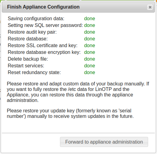 After the procedure is finished, a popup appears. Confirm and you should be forwarded to the management web UI of the new machine. The restore is complete and all configuration settings regarding the Appliance itself and LinOTP (i.e. tokens, UserIdresolver, policies and so on) should be the same as in the original machine.