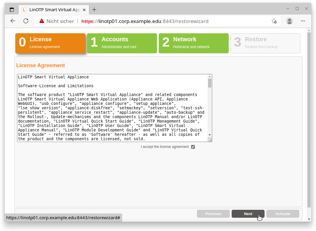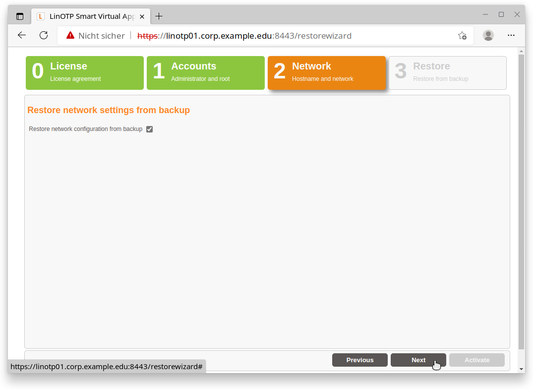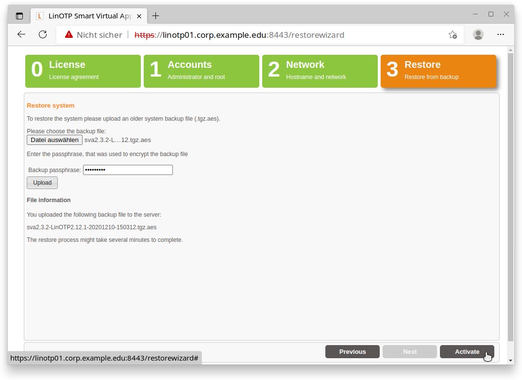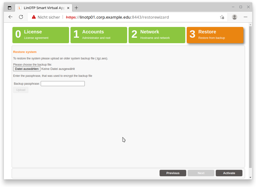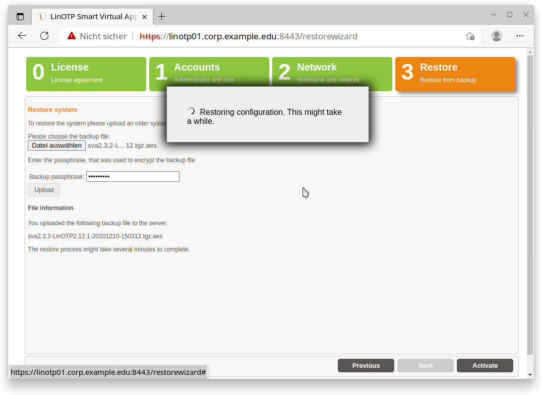 The full backup of a SVA version 2.x can only be restored at this point. If you decide to set up the new SVA without restoring the backup in the wizard it will be still possible to import the database and the encryption key via the Appliance dashboard (https://<LINOTP>:8443 –> System –> Restore, see Restore Settings and Data for details). A full restore is not possible anymore and will potentially damage the system.