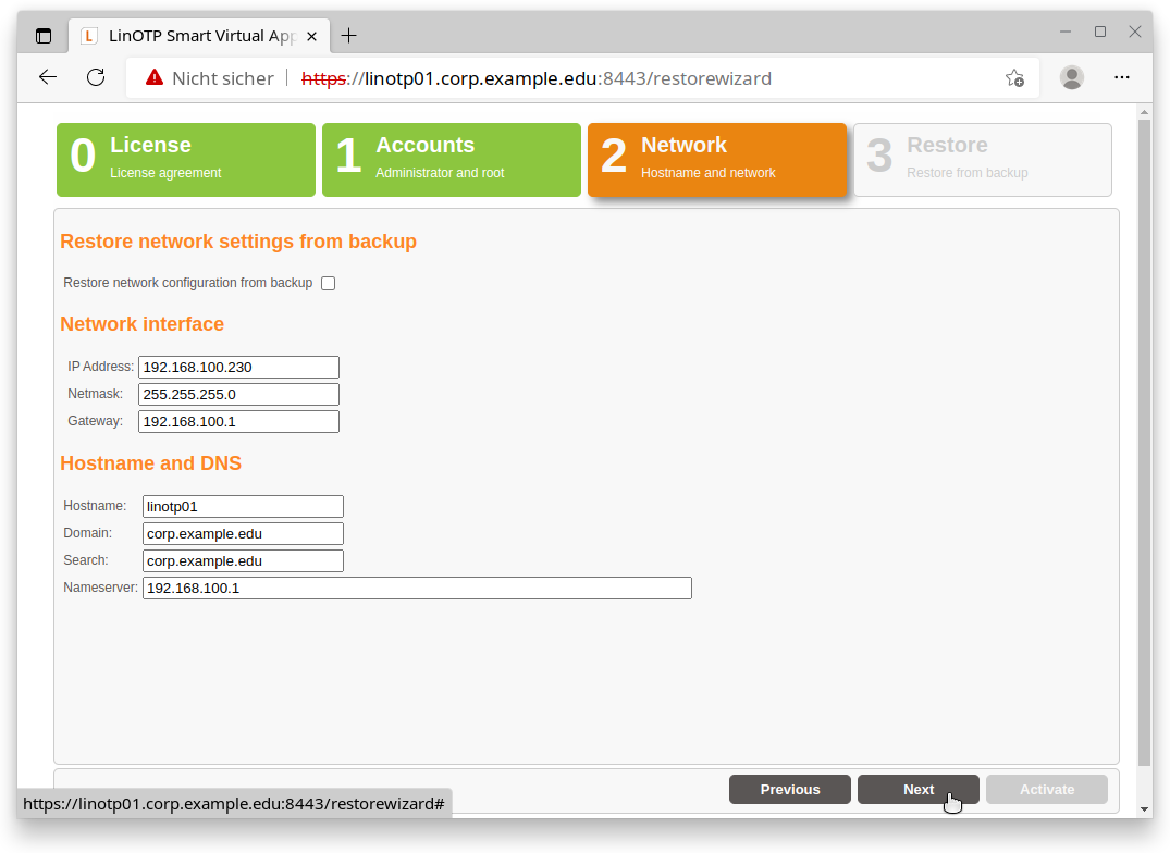 Please be aware: if your old Appliance is running in the same network environment as the new machine you should not restore the IP from the backup - because both machines would run with the same IP causing problems. So either shutdown the old machine or configure a different network setting for the new one. You can change this configuration at any time later in the management web UI.