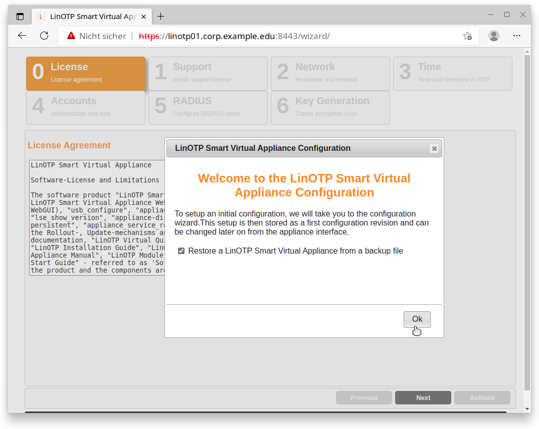 This is the setup wizard. It can be used to configure your new LinOTP Appliance and to restore your backup.