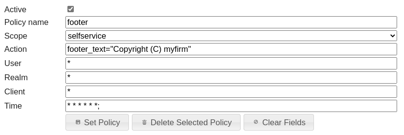 It is possible to customize the footer through policies. The footer text can be set using the footer_text policy.