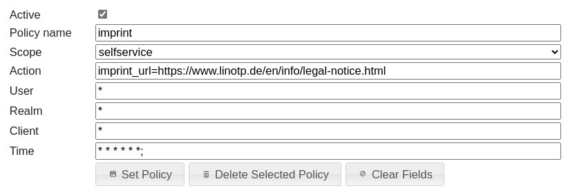 Additionally, there is the option to include a link to an imprint page (https://…) or a resource such as a PDF file uploaded to the custom assets (/selfservice/en/assets/…).