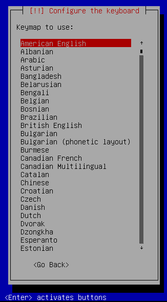 After a short boot process, the installation menu will appear. You can choose the keyboard layout used later in the optional command line environment.