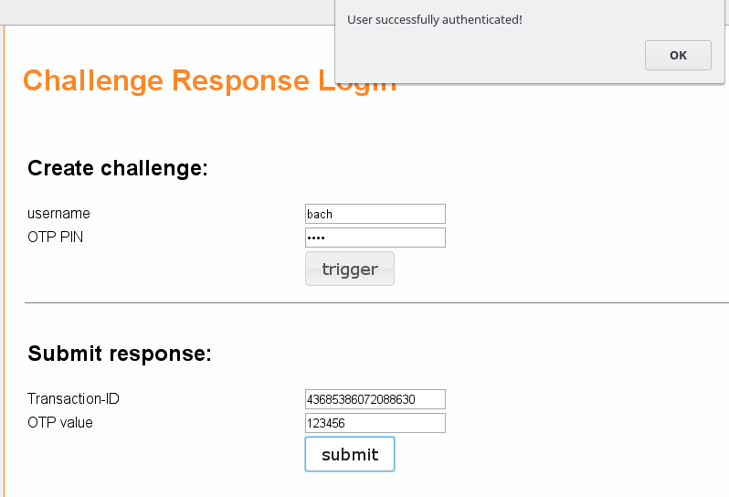 Enter username[@realmname] and OTP PIN (the PIN depends on the otppin policy, realmname is necessary for users in non-default realm) and press trigger. Now the OTP should be received depending on the used token (SMS, Voice, etc.). Enter the OTP in the “Submit response” section. Then press submit. A pop up appears which tells whether the authenication was successful or not.