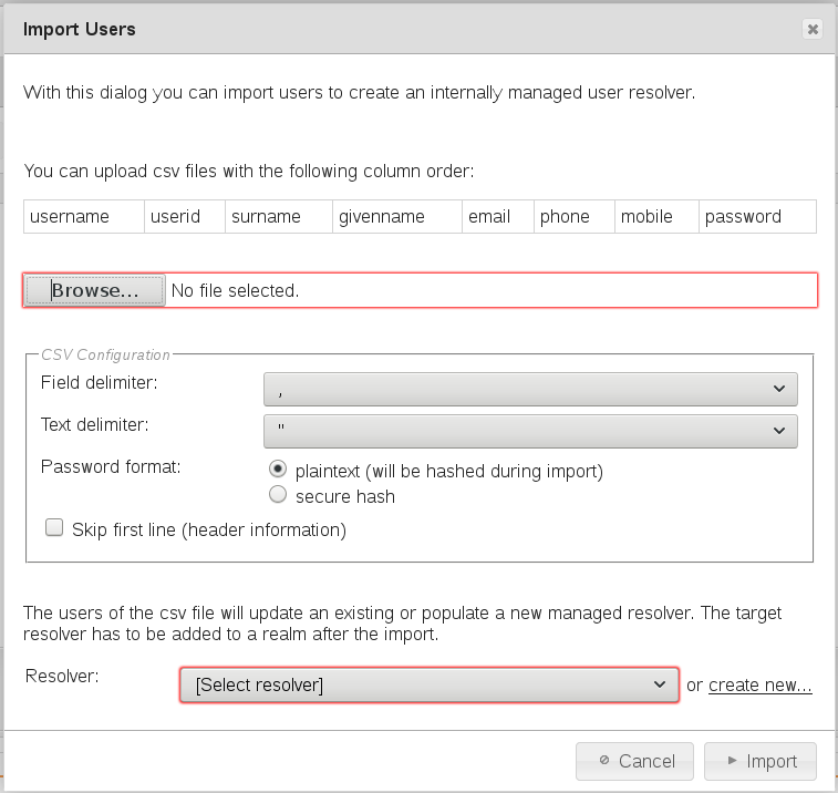 Please be aware - if an existing InternalSQLResolver is choosen the CSV will be applied. The users stored in the InternalSQLResolver after the import are exactly the same as in the CSV. So users existing in the InternalSQLResolver before which are not in the CSV will be deleted. Users already existing in the InternalSQLResolver and the CSV are changed accordingly to the new data from the CSV. New users are added (which implies existing users which are meant to be kept have to be stored in the CSV as well - otherwise they are lost).