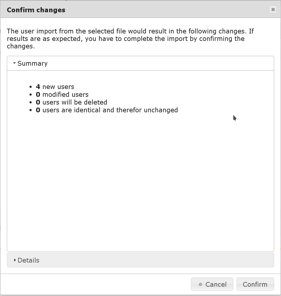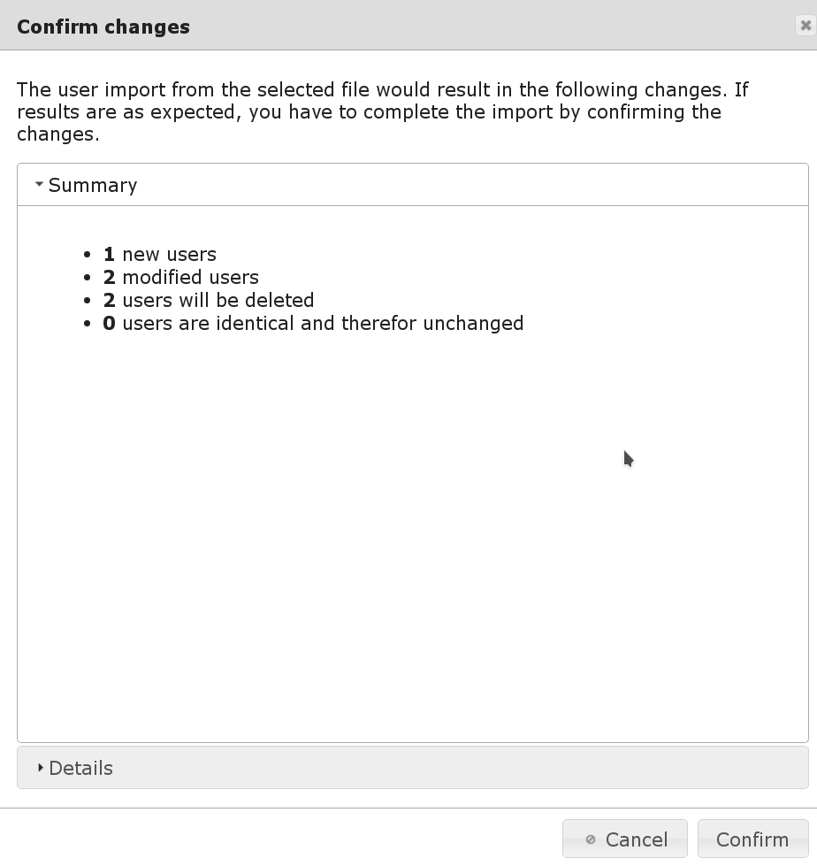 After the import the changes can be reviewed and have to be approved before they are actually performed:
