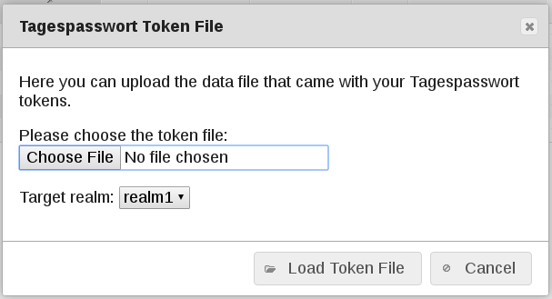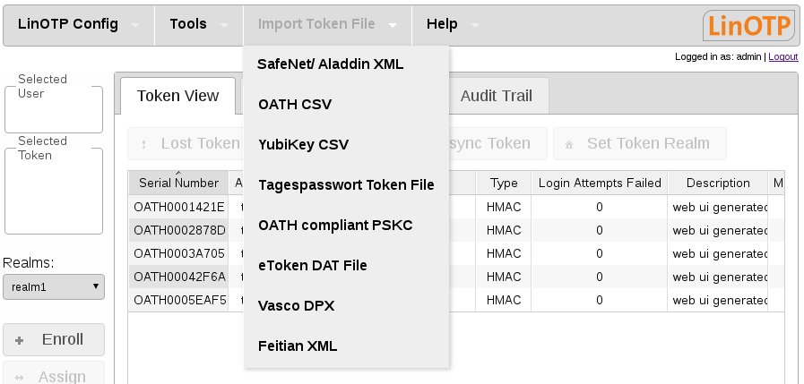 The Web management client can import different token files. Log in to the Web interface: http://YOURLINOTPSERVER/manage and click on “Import Token File” as shown below.