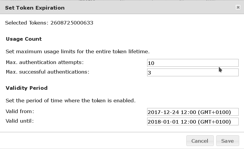 In some scenarios tokens should be only usable for a certain amount time or authentication attempts. Starting with LinOTP 2.10 tokens usage can be limited regarding: