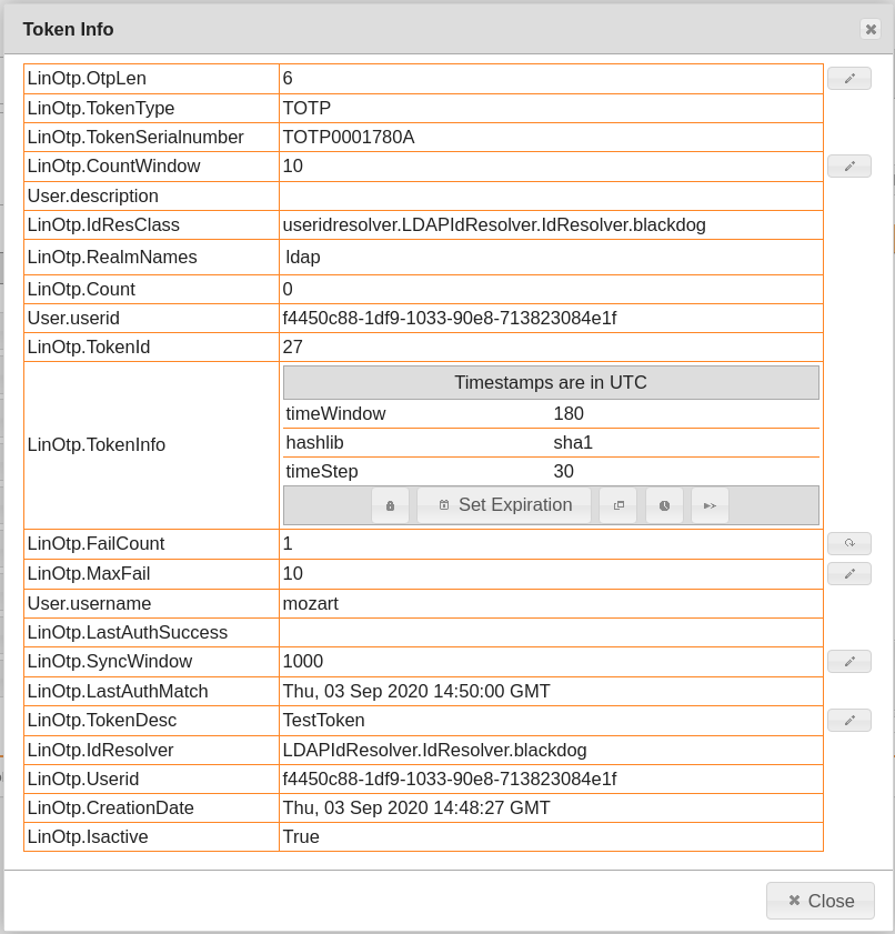 LinOtp.LastAuthSuccessTime to use this token the last time it was successfully authenticated. Activated and thus visible are the additional timestamps (CreationDate, LastAuthMatch, LastAuthSuccess) here under