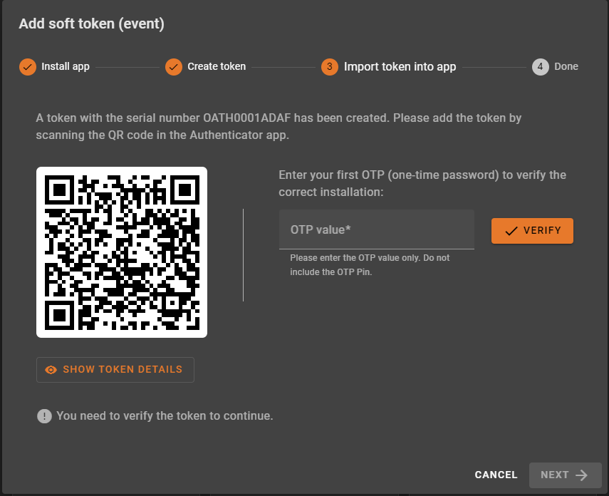 With verify policy enabled, users have to verify their newly created token before completing the enrollment process in Selfservice Portal. The goal of this policy is to ensure that users have a fully functional and tested token. This makes the enrollment process smoother for users and reduces the need for additional support from administrators. It is especially important when MFA is required to log in to Service. In such a scenario, users could potentially be locked out of Selfservice, if they discover that the token is not working after logging out of the portal.