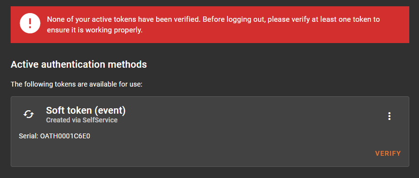 In addition, unverified tokens are marked with a “verify” button to make them easier to identify and verify. When clicked, the button opens a token verification dialog. If a user has no active verified tokens, they will also see a warning message in the token list view, reminding them to verify at least one token before logging out of Selfservice Portal. To use these two features, “Log usage timestamps in token info” must be enabled in the System Config.